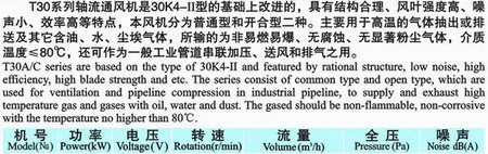 T30C型玻璃鋼外接式軸流通風(fēng)機(jī)具有結(jié)構(gòu)合理、設(shè)計(jì)簡單、靜壓及效率高、防腐性能良好、噪音低、運(yùn)轉(zhuǎn)平穩(wěn)、機(jī)械振動小、氣流順暢等特點(diǎn)。該系列風(fēng)機(jī)電機(jī)裝配在風(fēng)機(jī)筒體上部,有可調(diào)的電機(jī)支承座板,采用角帶傳動,從而使風(fēng)機(jī)所輸送的各種耐腐性氣體與電機(jī)隔離,保證電機(jī)使用壽命。風(fēng)筒內(nèi)采用外溝球面萬向軸承座,具有體積小、密封性能好等到優(yōu)點(diǎn)。該系列風(fēng)機(jī)主要適用于一般工業(yè)管道串聯(lián)加壓、送風(fēng)及排氣使用。所輸送氣體不允許含有粘性物質(zhì)、所含粉塵及硬質(zhì)顆粒≤150mg/m3、氣體溫度≤60℃、相對濕度≤100%。